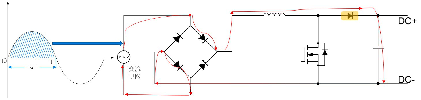 - 设备接入电网瞬间,PFC升压电流中的滤波电容近似短路,电网电压接入后,会形成上图中的红色电流路径(路径之一);