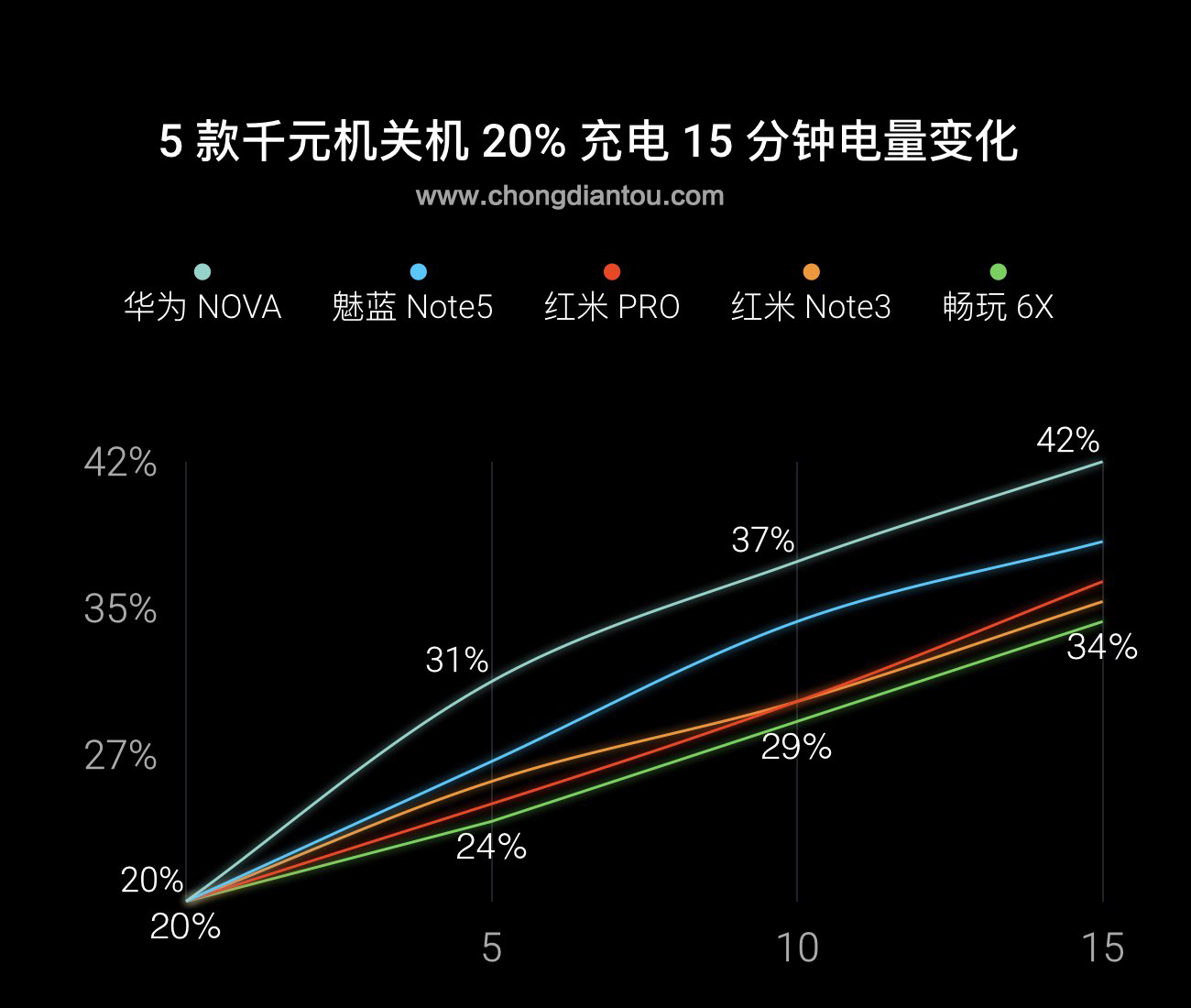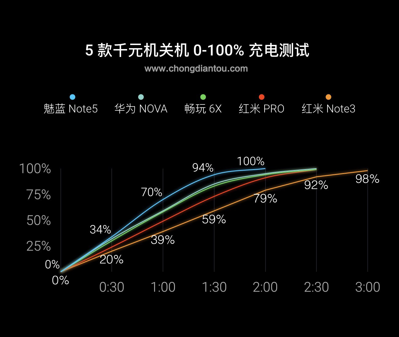 排在第一位的魅蓝Note5领先排在第二位的华为Nova 5.6%,领先最后一位荣耀畅玩6X 59%,显示出快充的极大优势。