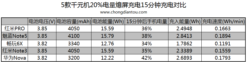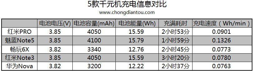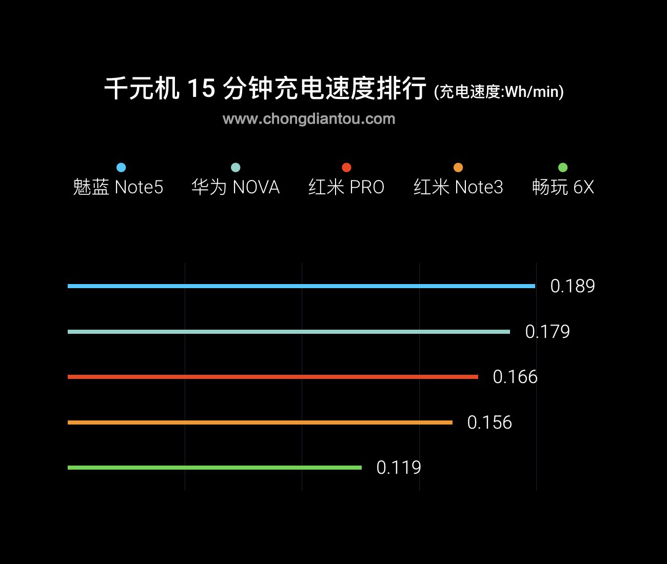 最先完成充电的是魅蓝Note5,4100mAh容量的电池,两个小时完成充电,当然这与魅蓝Note5使用了快充技术有关。其他四款手机均没有使用快充,只能普通充电。华为Nova排在第二,耗时2小时37分,荣耀畅玩6X排在第三,耗时2小时45分。排在第四的是红米PRO,耗时2小时53分。最后一位是红米Note3,充完耗时3小时20分。考虑到充电百分比除了快充技术以外,还和电池自身的电压高低、容量大小有关,因此我们使用单位时间充入电池的能量也就是Wh/min作比较。