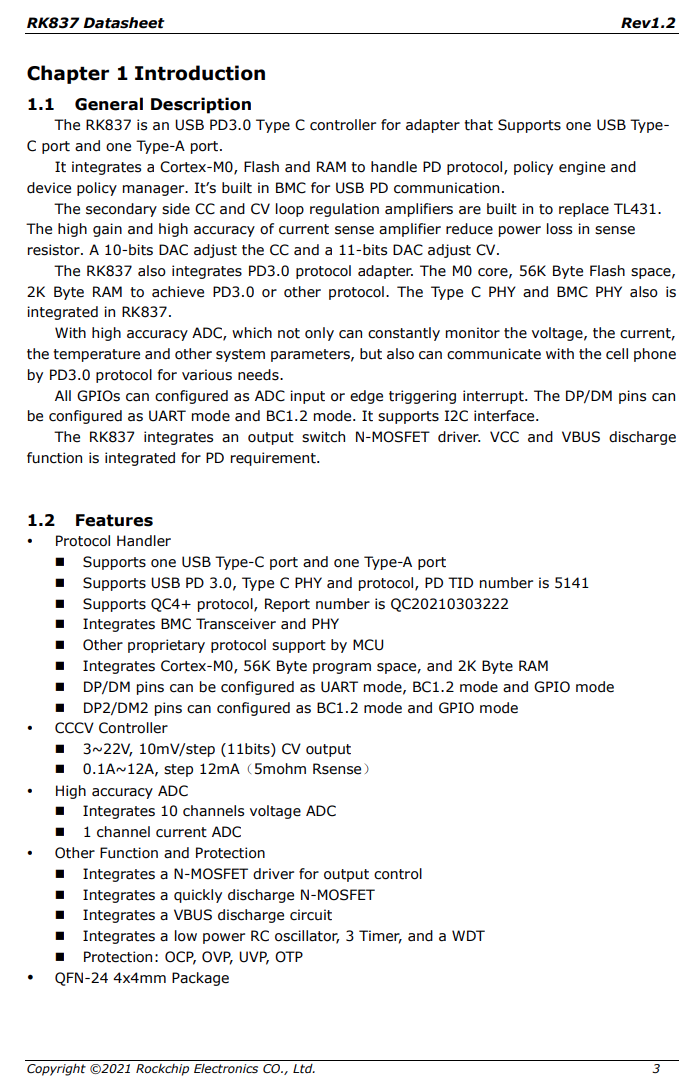 瑞芯微RK837是通过了PD2.0/PD3.0/PPS认证的PD3.0协议芯片,TID:5141。同时,也通过高通QC4+认证,证书编号20210303222。RK837内部集成ARM Cortex-M0内核,56K Flash和2K RAM来实现PD和其他专有协议,可以支持10万次以上的重复烧录。