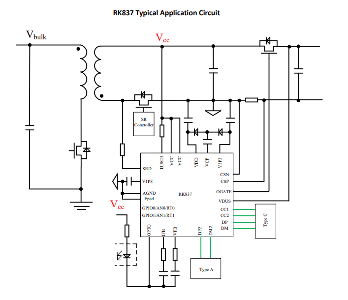 RK837支持I2C接口和光耦反馈,可与PI支持I2C接口的高集成数控电源共同使用。内部集成NMOS驱动,用于输出VBUS开关管,可使用低成本性能好的NMOS。内部集成放电MOS管,用于负载断开时迅速将滤波电容的电压泄放掉。