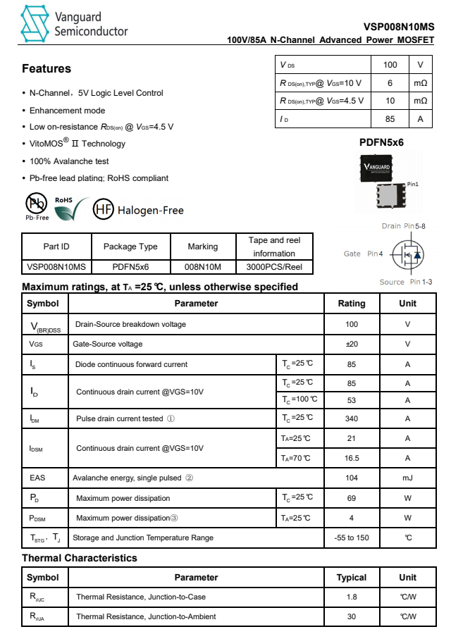 同步整流管采用威兆VSP008N10MS,耐压100V,PDFN5x6封装。