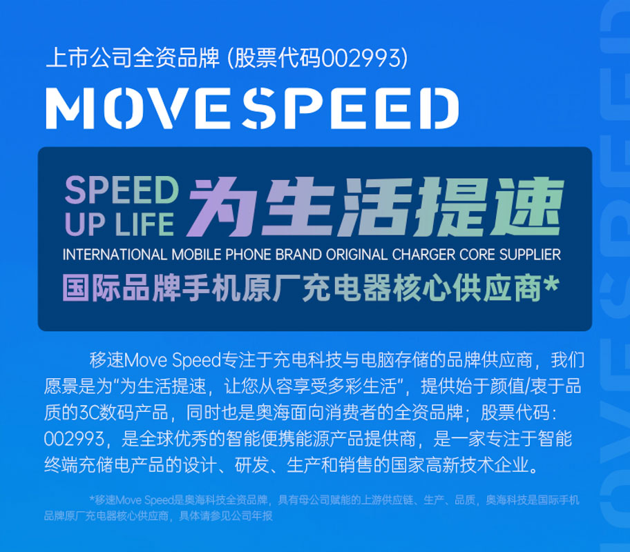 充电头网曾介绍过,奥海科技是华为、小米、OPPO、vivo等众多手机原装附带充电器的核心制造商,拥有强大的技术开发能力与过硬的质量品控,同时,奥海科技也是一家卓越的上市科技公司,而MOVE SPEED移速是奥海科技面向消费者的全资品牌。