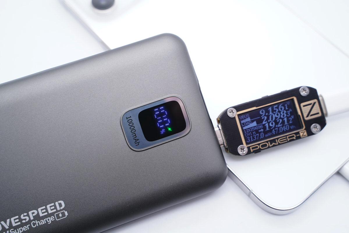 仔细观察还可以发现充电宝自带的数显屏还自带闪电快充标识,当充电宝在快充工作时指示灯亮起,这样可以方便用户判断充电宝的工作状态。