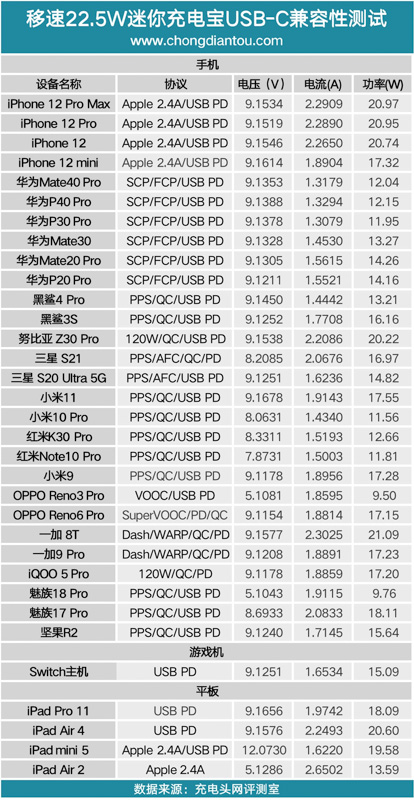USB-C接口的测试数据汇总,为大部分设备均可以提供PD快充服务,整体表现不错,暂时没有发现不兼容的情况。