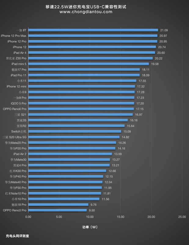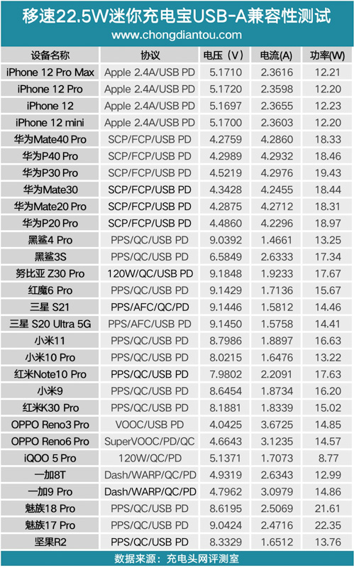 USB-A的测试数据这里,iPhone手机稳定在12W左右,华为手机的功率在20W左右,其他大部分手机都可以触发快充,具体数据可以查看图表。