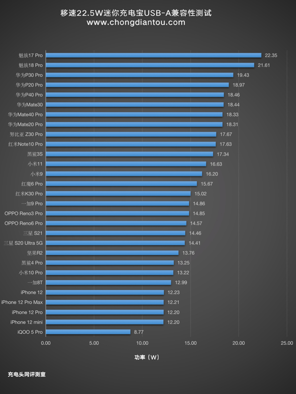 柱状图这里魅族两款机型的功率最高,华为手机紧随其后。