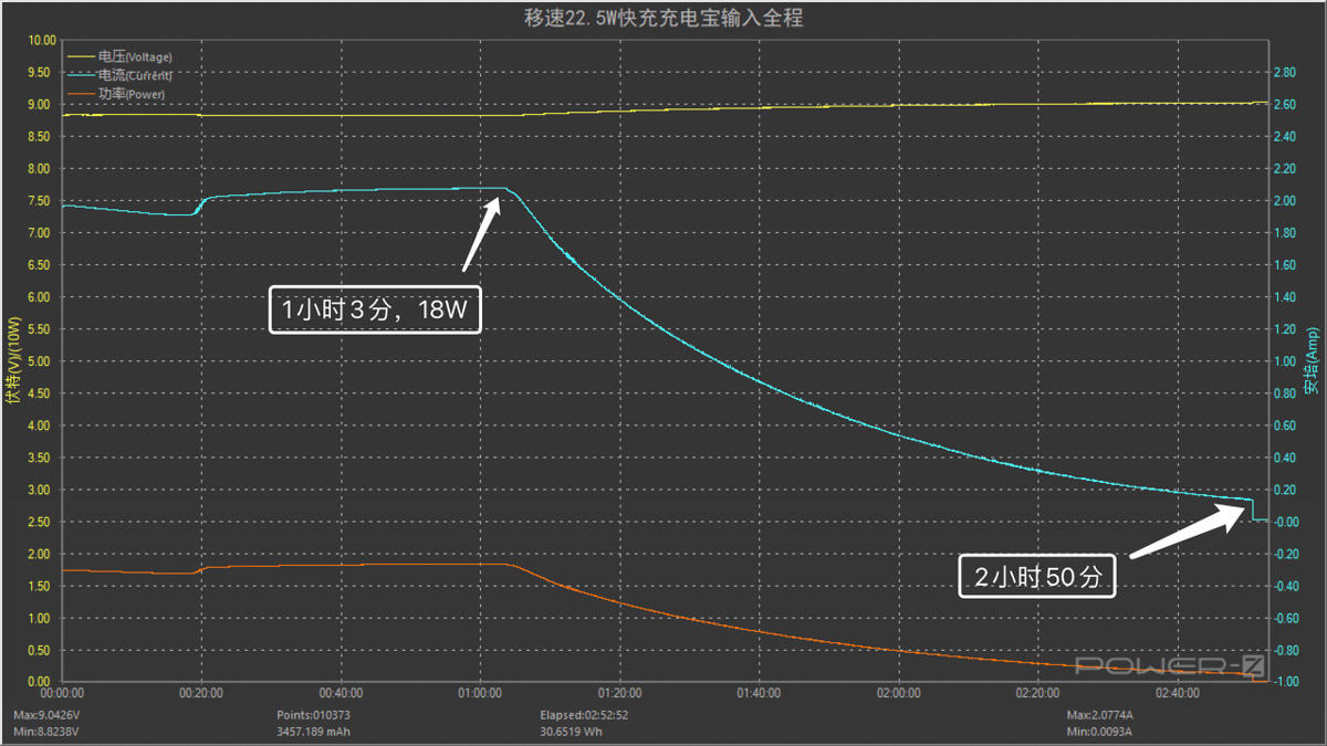 这是使用PD充电器为充电宝自充电的全程,在1小时3分前功率处于18W输入状态,随后功率和电流逐渐下降,直至2小时50分充电结束。