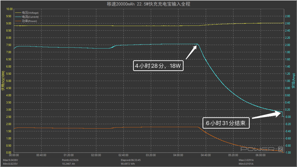 这是20000mAh版本的自充全程,4小时28分前持续以18W的功率输入,6小时31分自充电结束。