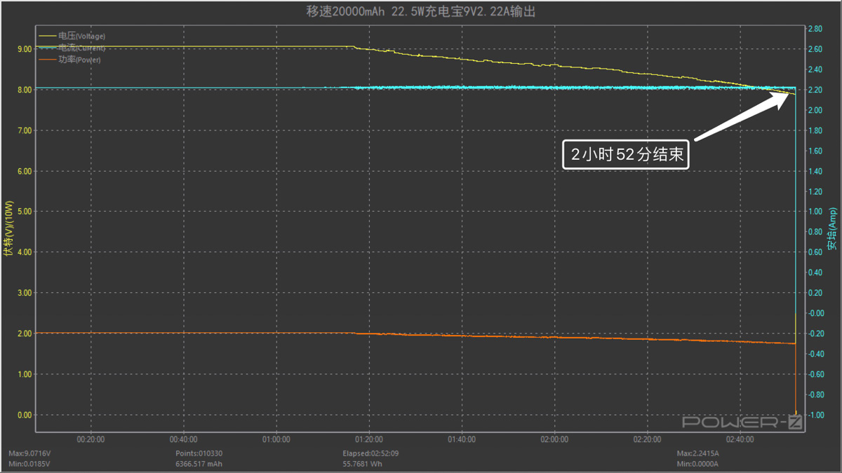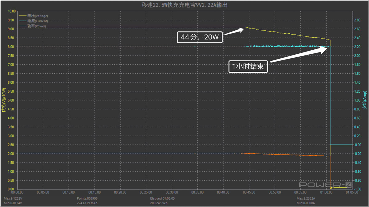 这是让充电宝以9V2.22A 20W的功率持续输出,44分钟前处于20W输出状态,随后电压小幅下降,1小时后测试停止。