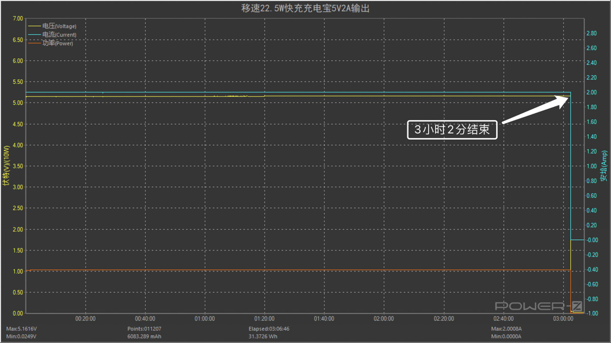 让充电宝以5V2A 10W的功率持续输出,测试持续到3小时2分结束。放出的能量约为31.3726Wh,所以充电宝在以5V2A档位输出时的效率约为31.3726/38.5=81.48% 。