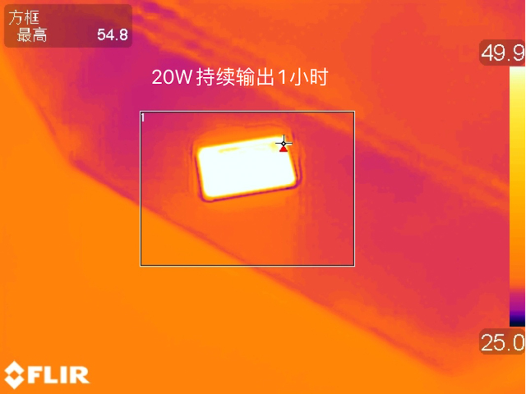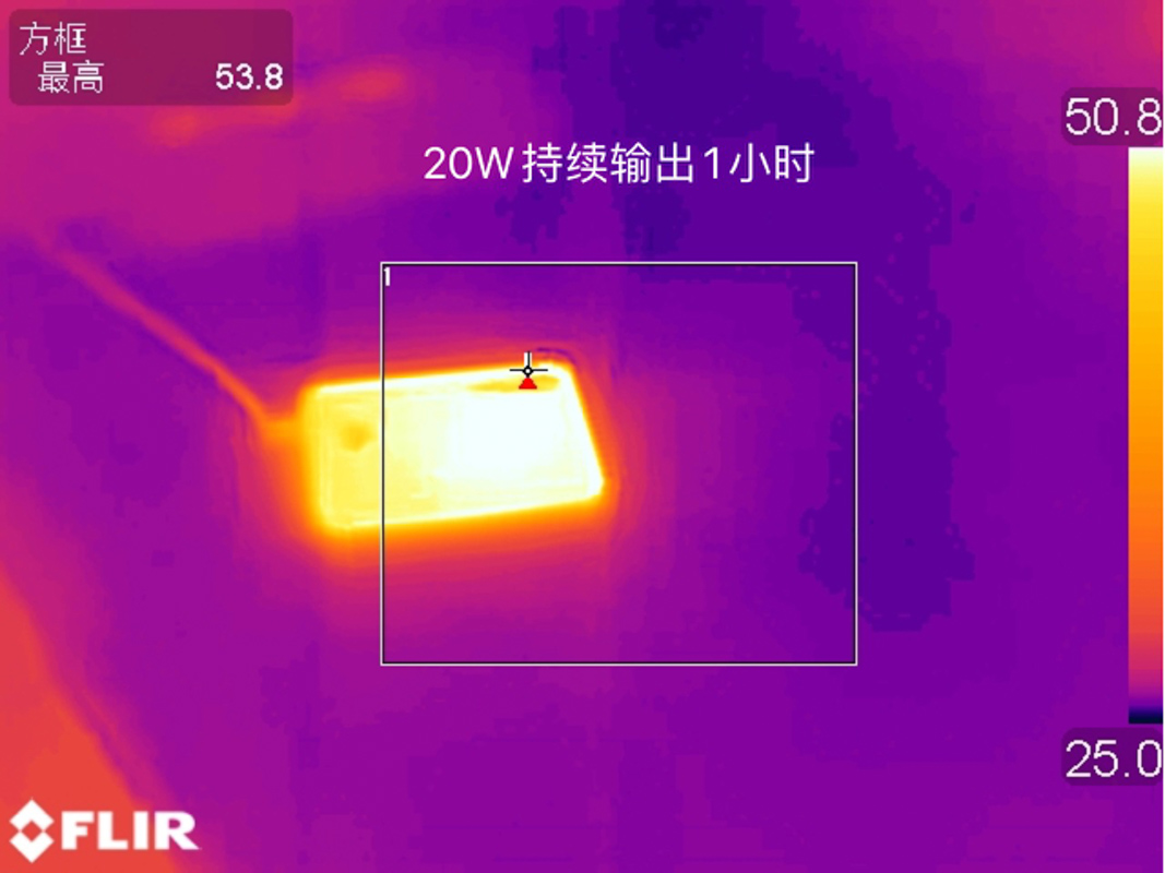 充电宝以20W的功率持续满载输出1小时后充电宝表面的最高温度为53.8℃。