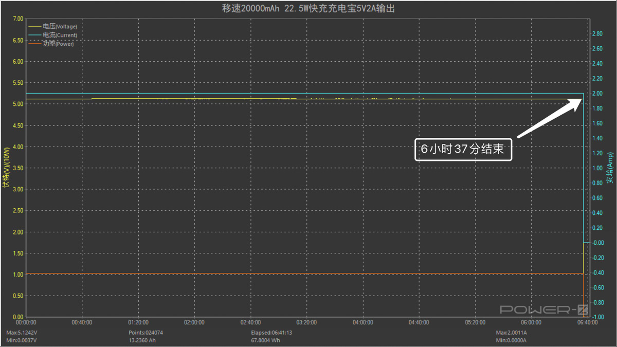 让充电宝以5V2A 10W的功率持续满载输出,整个测试过程持续了6小时37分。放出的能量约为67.8004Wh,所以充电宝在以5V2A 10W的功率输出时的效率约为67.8004/77=88.05%。
