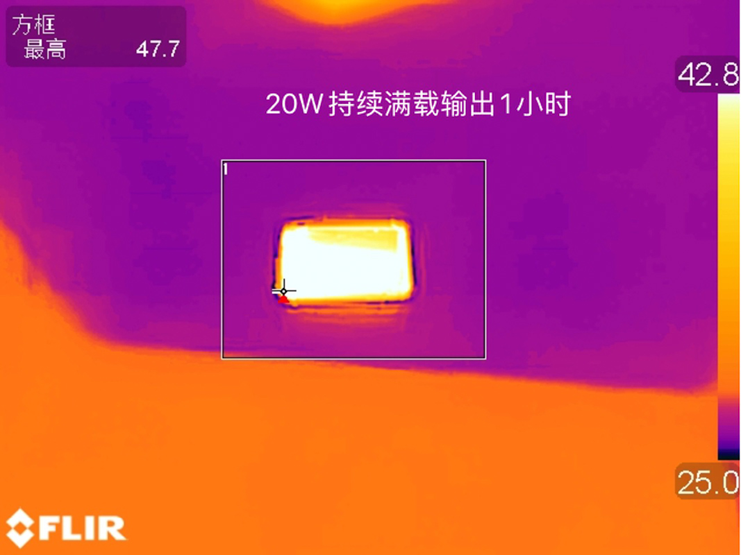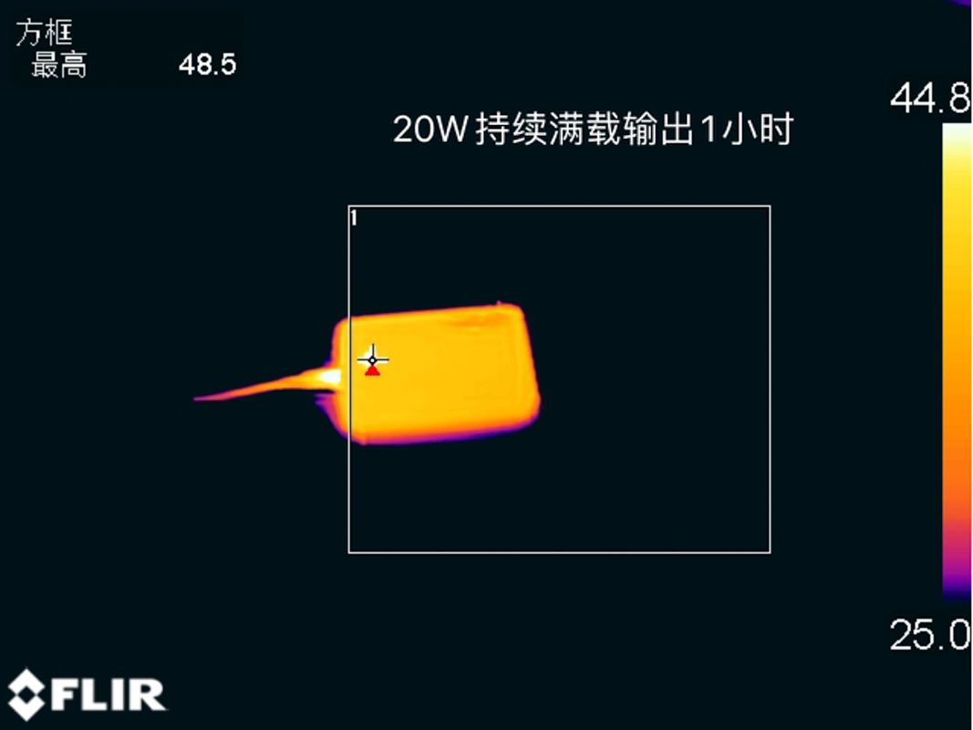 这里同样采集了充电宝的温度情况,依旧是20W功率持续满载输出1小时,在25℃的恒温箱内进行。充电宝表面的最高温度为48.5℃。