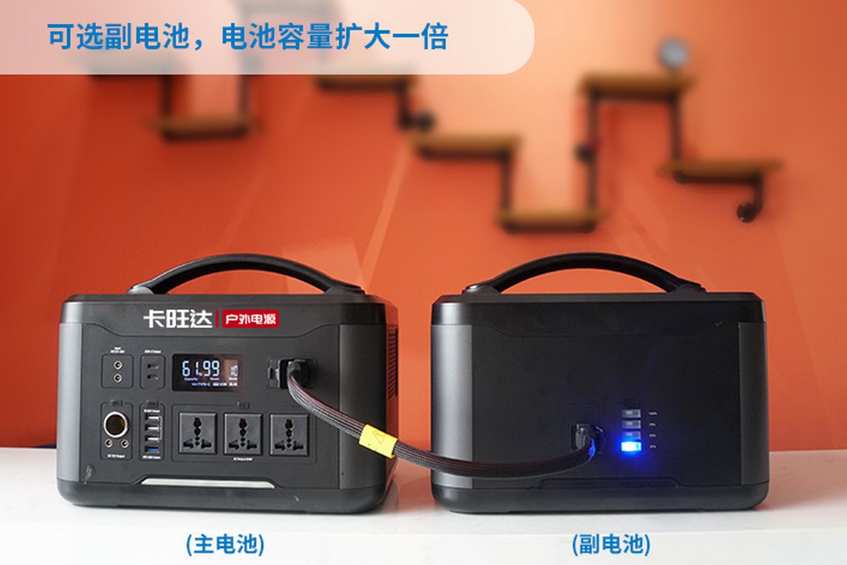 卡旺达电+1300户外电源本体自带400000mAh (1280Wh)超大容量锂离子电池组,并可以选购副电池连接使用,通过右上角大电流接口进行连接,提供翻倍容量支撑更长的续航。