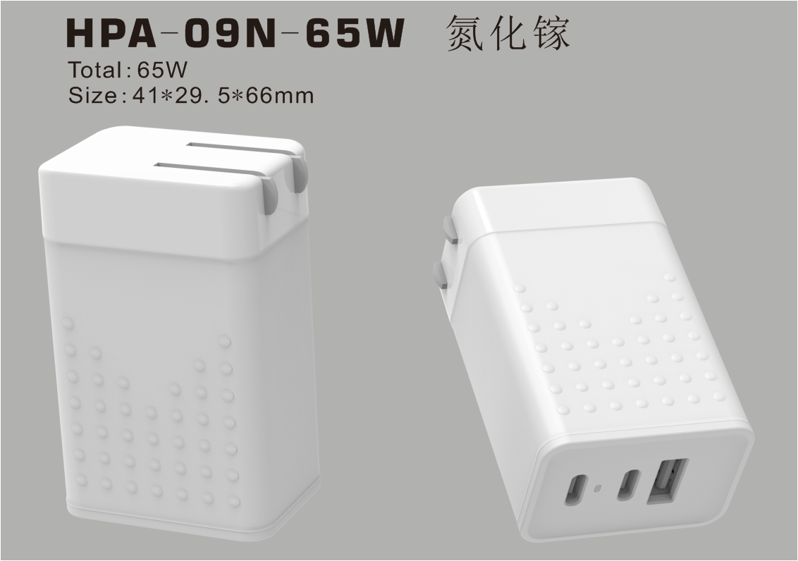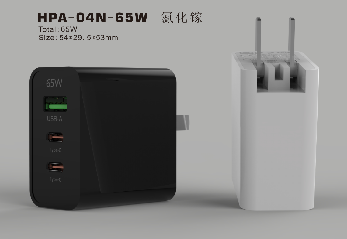 华科生另一款2C1A 65W快充氮化镓充电器采用波点造型设计,输入端配备可折叠插脚,产品采取灌胶工艺,让产品体积更小。输出顶面配有2C1A接口,两个USB-C口都支持65W PD快充,USB-A口支持全协议,支持最大24W QC快充和华为22.5W SCP快充,A口最大功率可达到60W。此外充电器还支持45W+18W双口同时快充,满足笔记本和手机同时用电需求,外带出差方便。