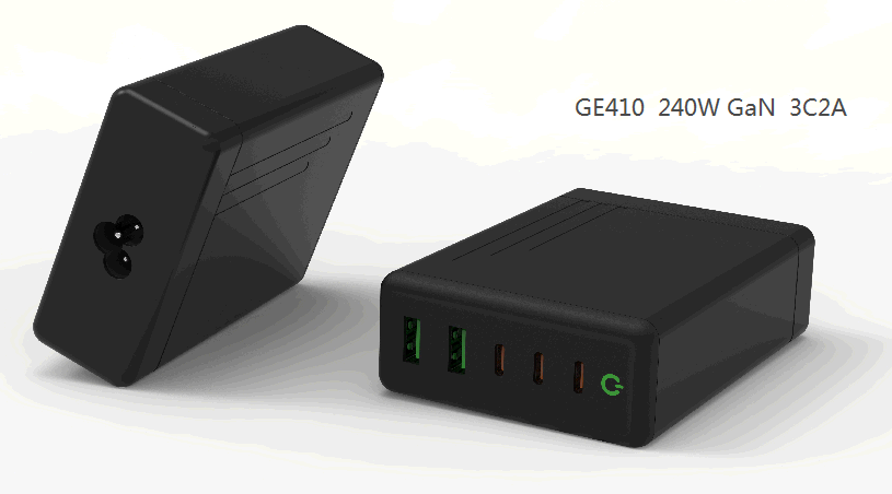 华科生最新一款3C2A 240W快充氮化镓充电器采用桌面型设计,输入端小梅花3Pin。输出顶面配有3C2A接口,前面两个USB-C口都支持100W PD快充,USB-A口支持全协议,支持最大18W QC快充和华为22.5W SCP快充。此外充电器C2和C3同时使用时候,C2降功率65W,C3 20W。5口同时使用时候都快充,可以同时满足2台笔记本和3台手机同时充电需求,外带出差方便。