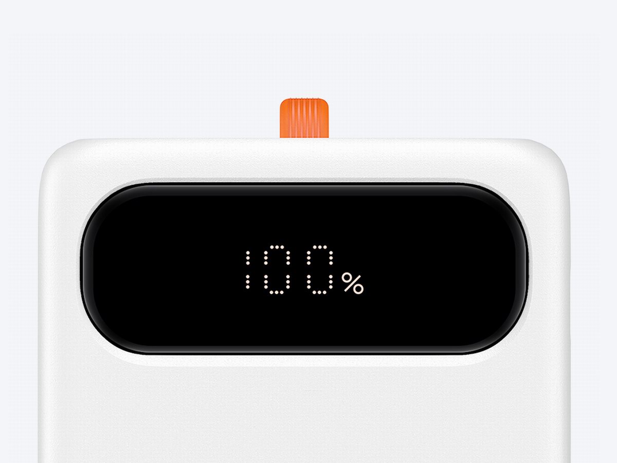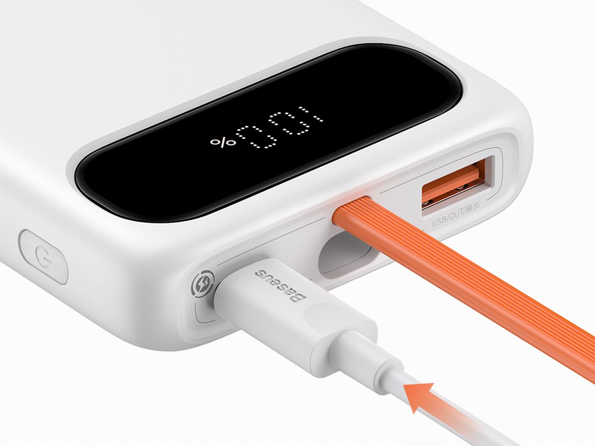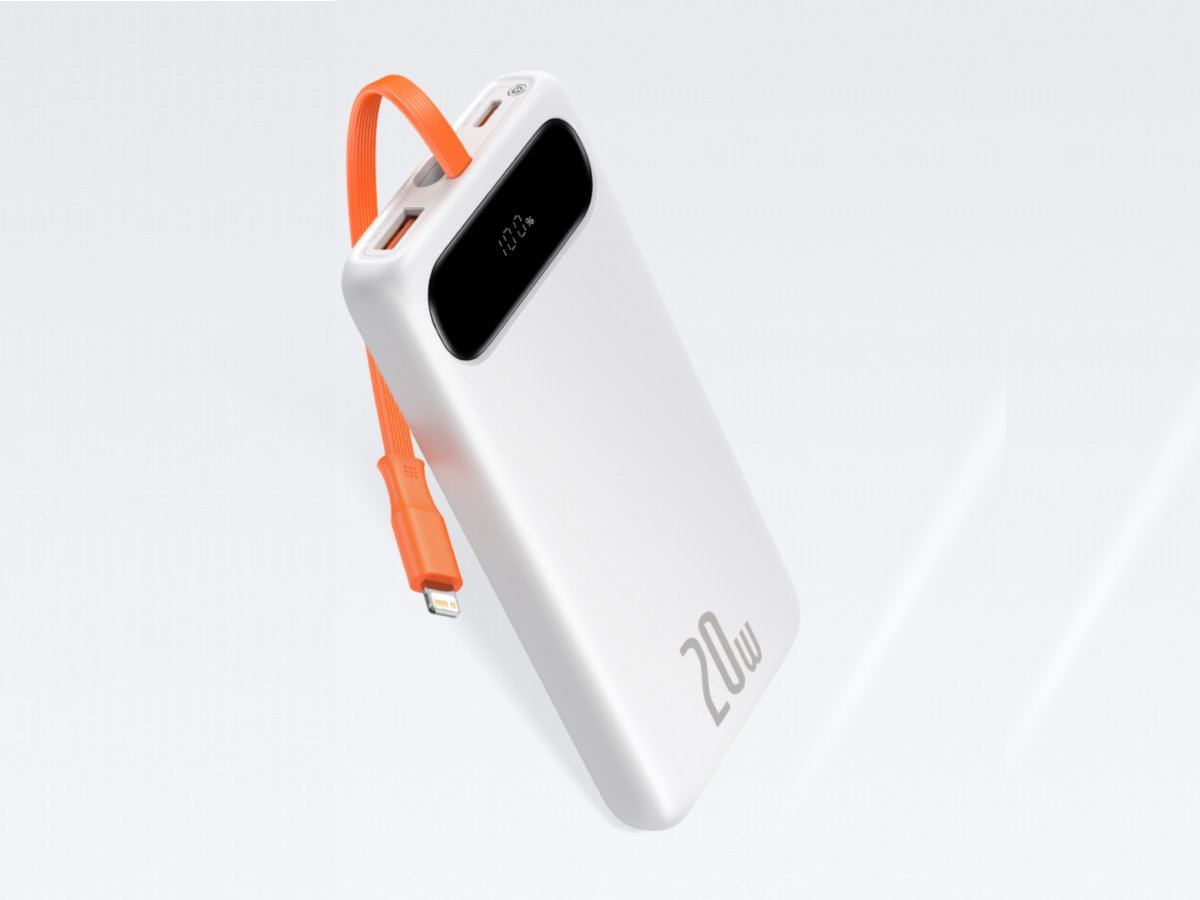 倍思布洛克带线数显快充移动电源采用扁平式外观设计,白色珠光壳体上带有一片黑色半透区域,底部是百分比电量显示屏,自带一根数据短线,适配苹果20W快充,并带有1A1C接口。内置最常用的10000mAh容量电池组,是便携与续航的均衡点,适用于大部分短途出行需求。