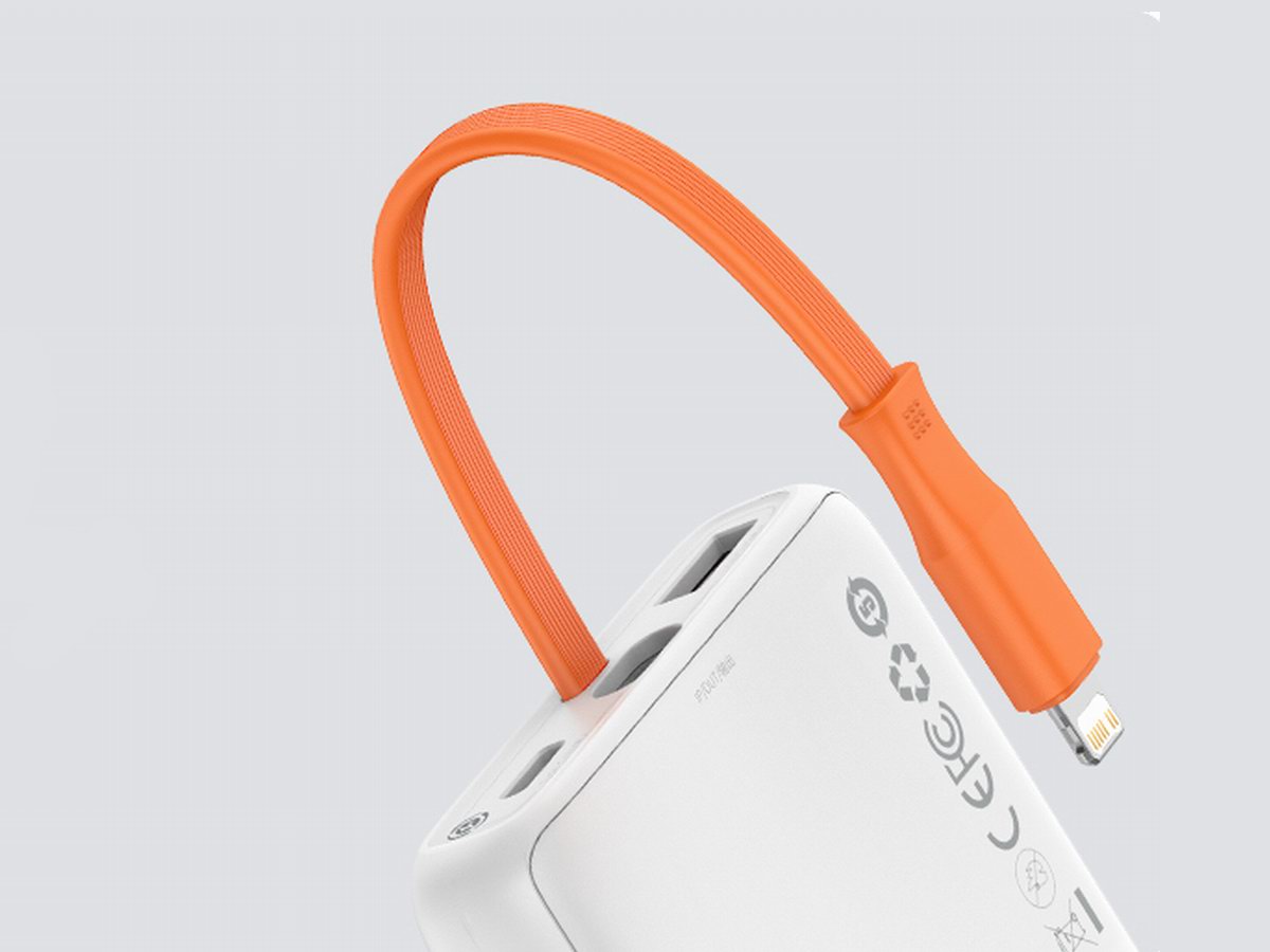 倍思布洛克带线数显快充移动电源最大特色莫过于其集成了一根苹果Lightning口数据线,外出不必再额外携带线材,直接可用。线材采用柔韧的TPE材质制作,耐拉抗弯折,端子头采用人体工程学设计,易于手拿插拔。