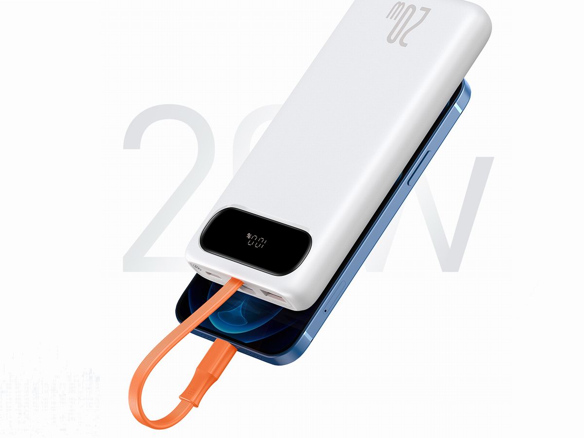 倍思布洛克带线数显快充移动电源自带苹果快充线,支持iPhone 12系列20W快充,外出无需额外带累赘的线缆,出行说走就走。内置10000mAh容量电池,并带有百分比电量显示屏,无需猜测准确对充电做出规划,自带1A1C快充接口,支持20W PD快充输出,并兼容QC、PE、AFC等常见的快充协议,适用于不同新旧数码产品使用。