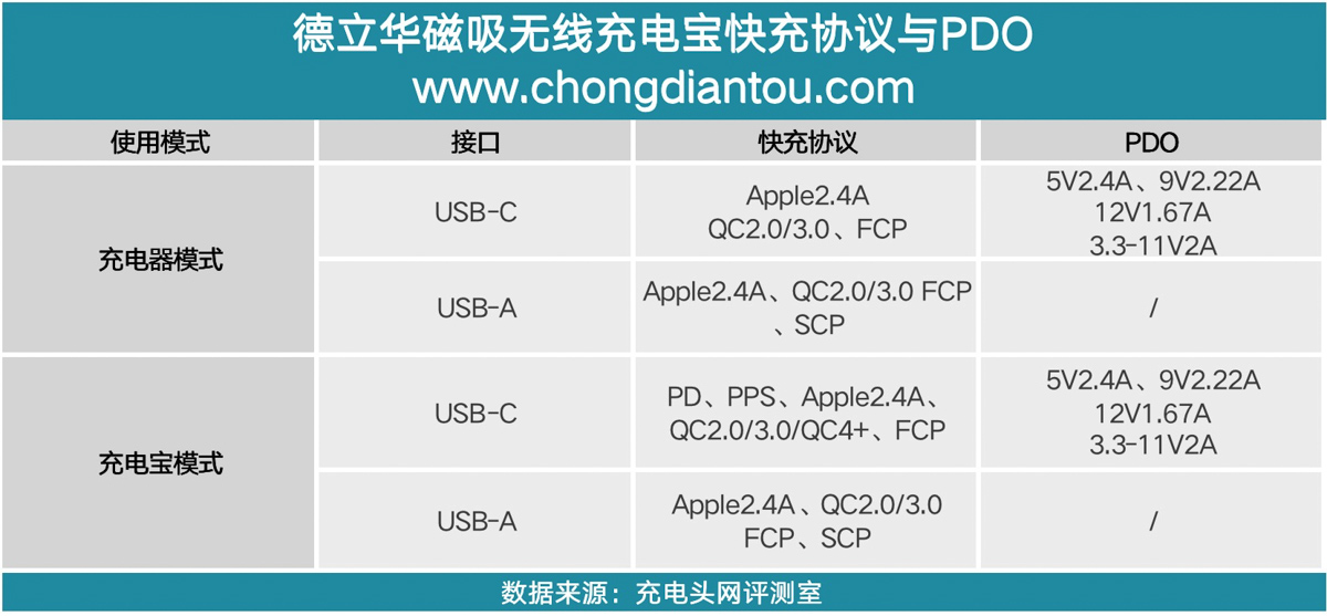 德立华多合一磁吸无线充电宝既可以作为充电器使用也可以作为充电宝使用,这是两种不同的使用模式下各个接口所支持的快充协议与PDO一览。