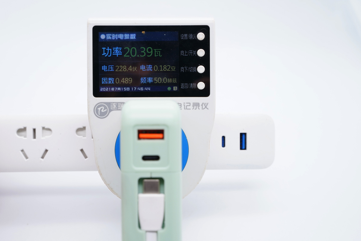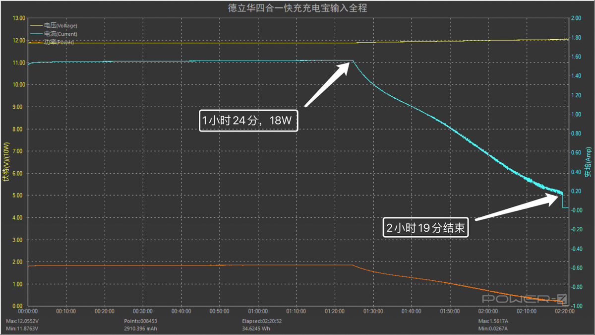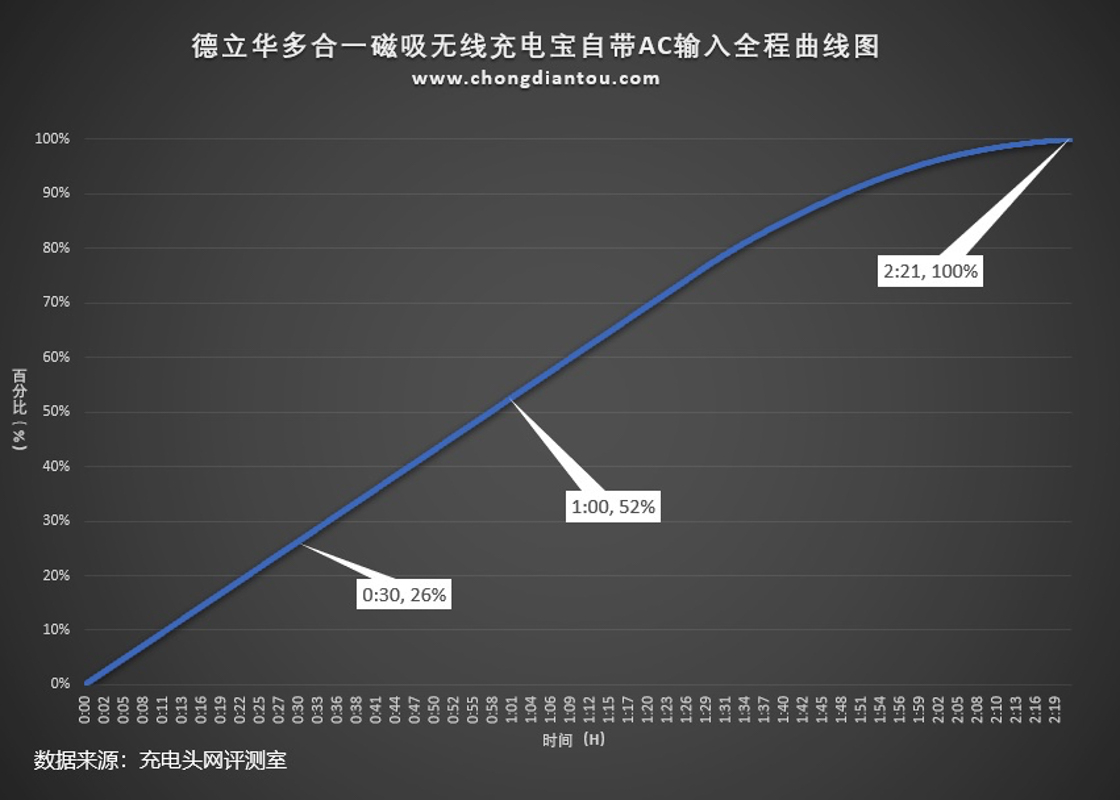 这是使用功率计采集的通过自带的AC插脚为自身恢复电量的全程曲线图,可以看到德立华多合一磁吸无线充电宝完全充满电需要2小时21分,和通过USB-C输入的时间差不多。