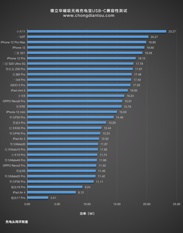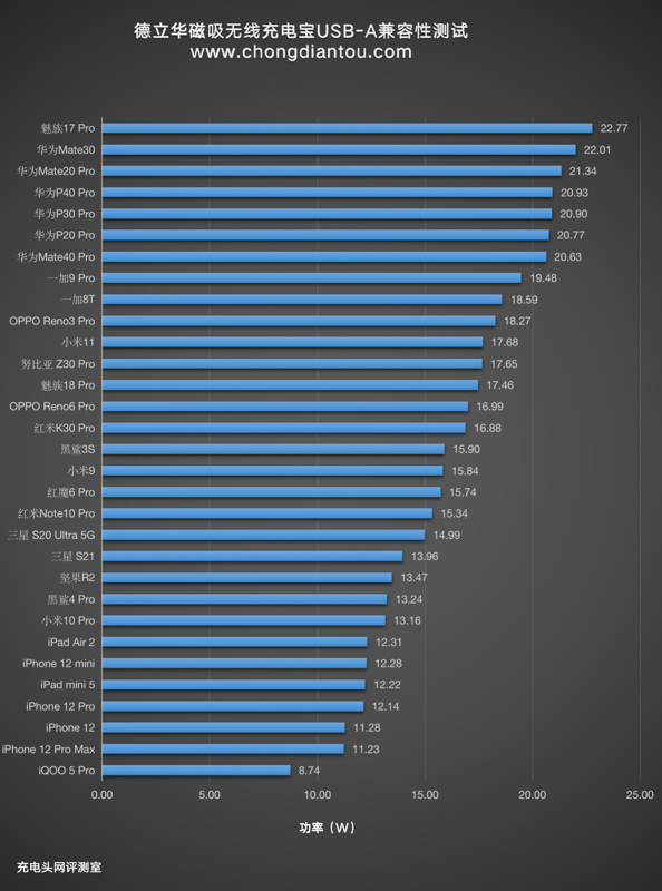 柱状图这里魅族17 Pro的功率最高,达到了22.77W,随后是华为的数款机型,均在20W以上,其他机型的功率在11W-20W之间不等。