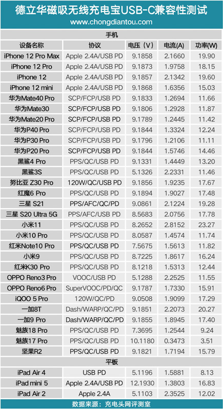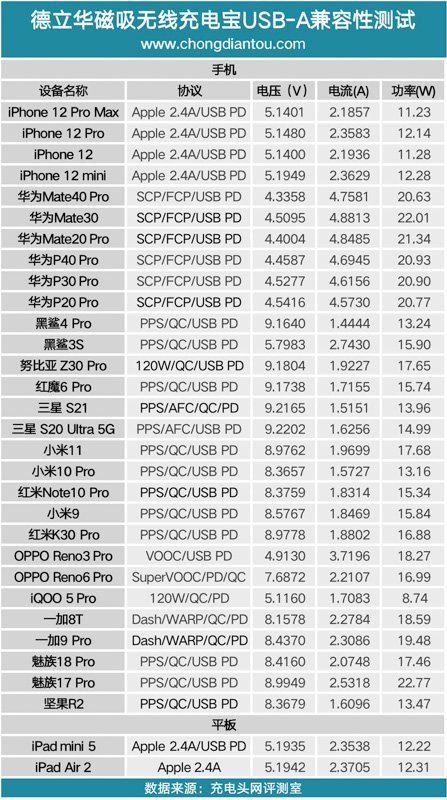 测试数据汇总,苹果设备稳定在12W,对华为手机可以提供4.5V5A、5V4.5A的SCP快充,对于其他设备则可以提供QC快充服务。
