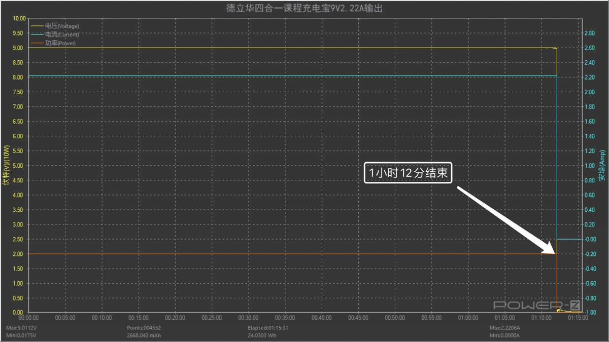 将输出功率提升至9V2.22A 20W,整个测试过程持续了1小时12分,放出的能量约为24.0303Wh。