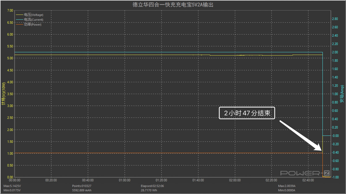 德立华多合一磁吸无线充电宝在以5V2A 10W的功率持续输出时,最终测试到2小时47分结束。放出的能量约为28.7170Wh。