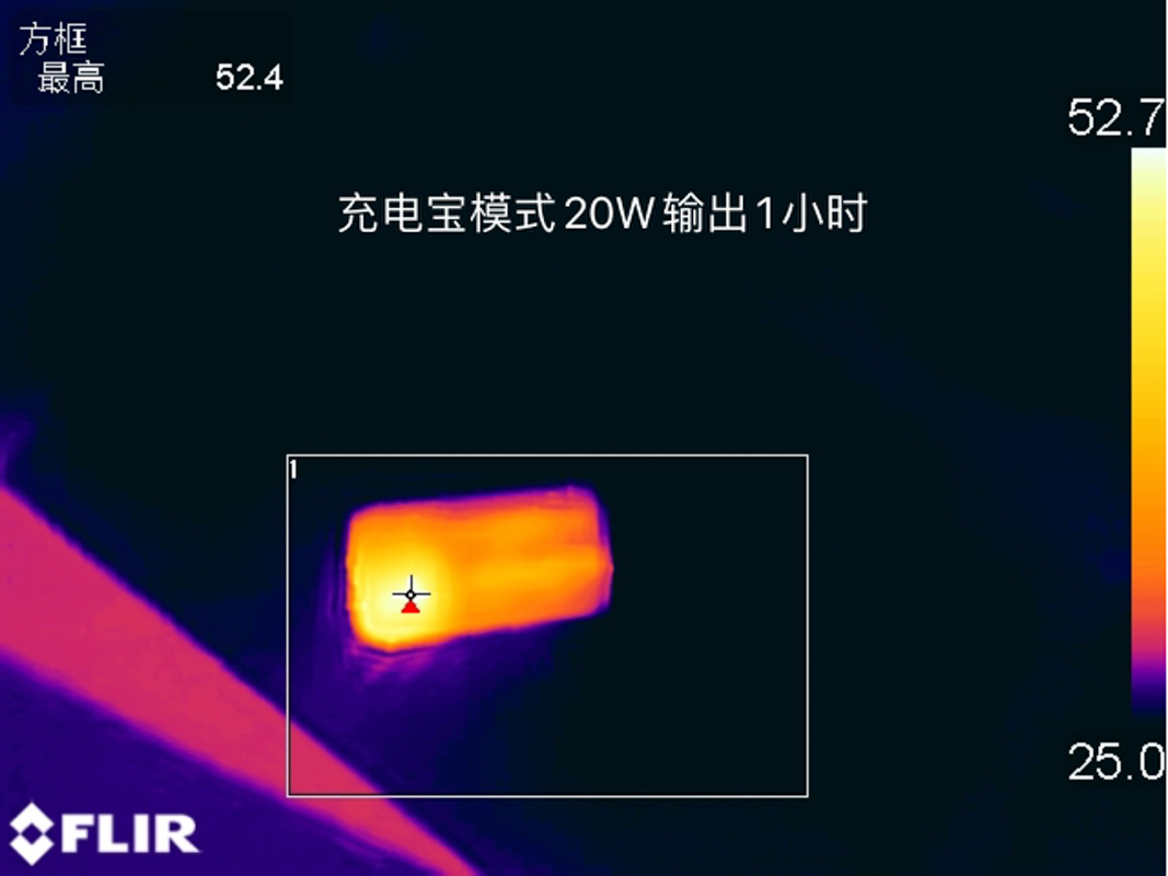 将德立华多合一磁吸无线充电宝放在25℃的恒温箱内,以9V2.22A 20W的功率持续满载输出1小时后采集到表面的最高温度为52.4℃。