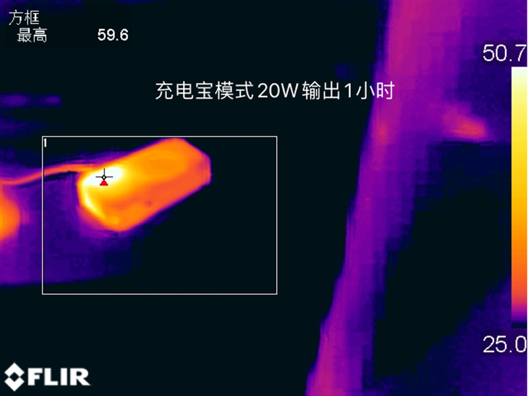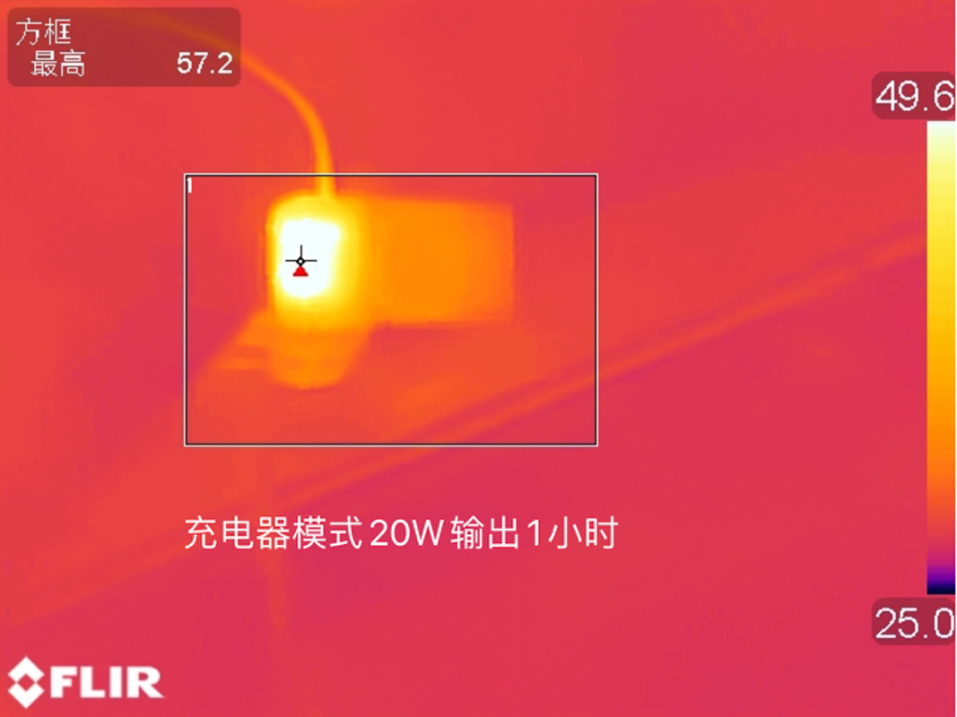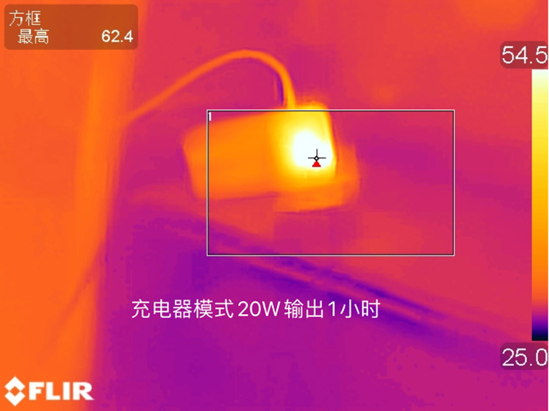让德立华多合一磁吸无线充电宝以9V2.22A 20W的功率持续满载输出1小时后采集到表面的最高温度为62.4℃。