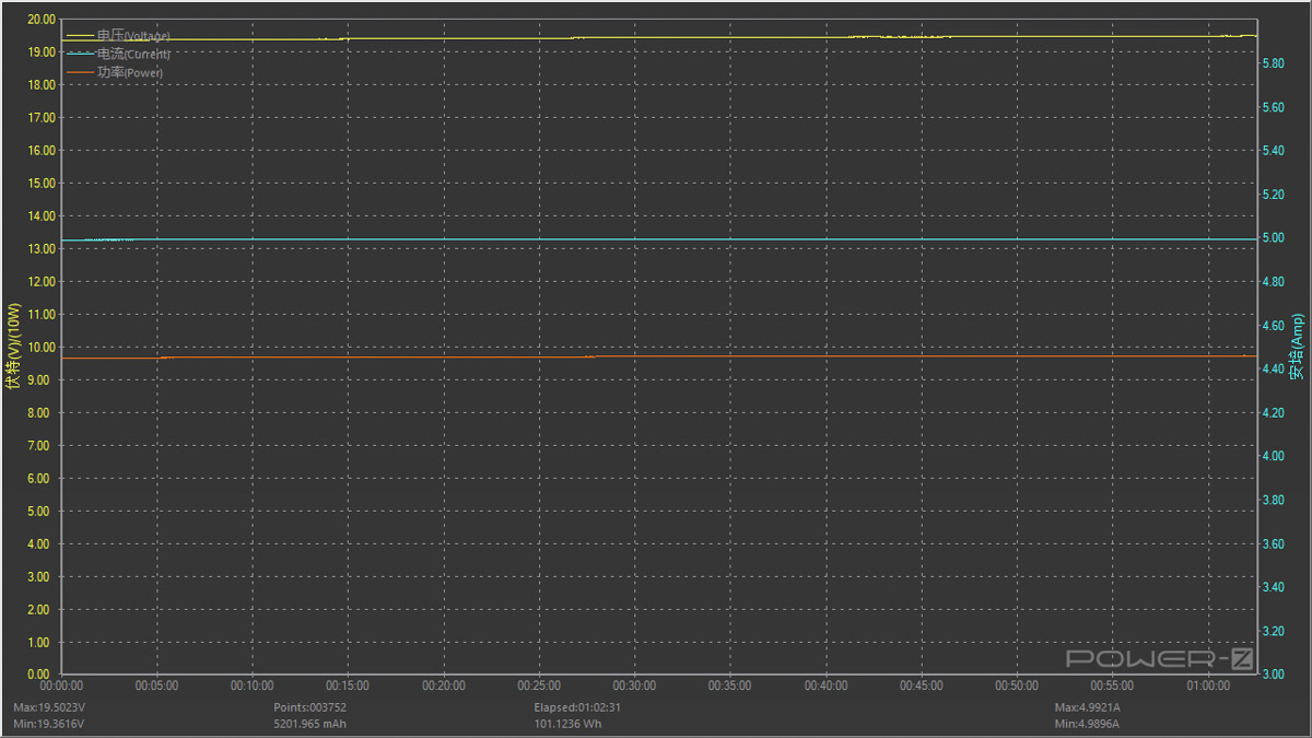 在对充电器模式下进行温度测试的同时也测试了产品作为充电器使用时的满载稳定性,可以看出输出电压十分稳定,即使长时间输出也可以提供满载输出功率。