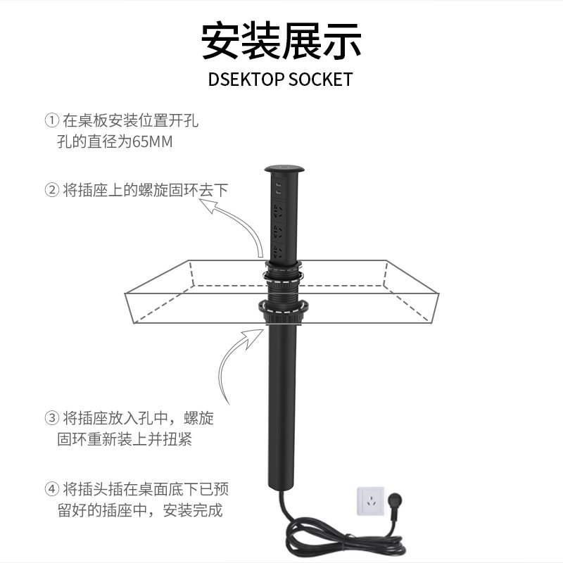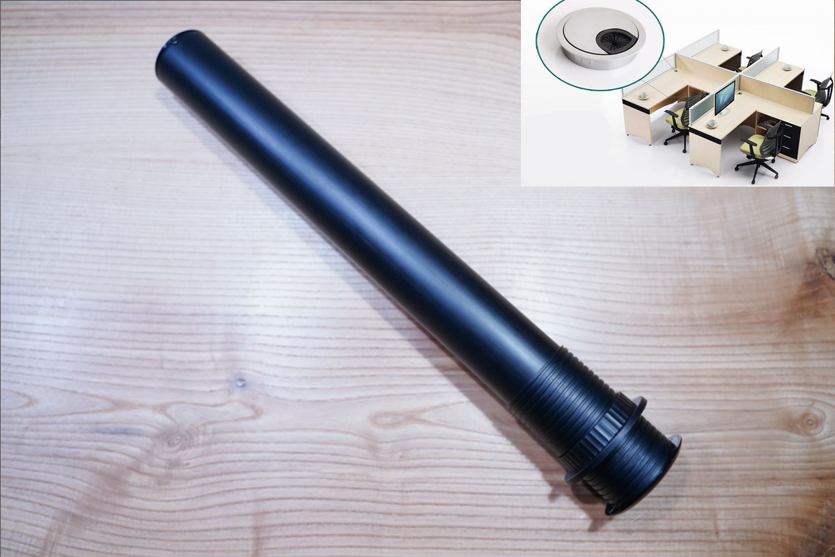 良工桌面电动升降插座外形类似一根圆柱形黑色棍子,将复杂的升降电机、插座接口、USB快充模块全部集成到圆柱内。办公桌穿线孔de 孔径为65mm的均可使用,直接放入孔内拧紧顶环即可完成安装。