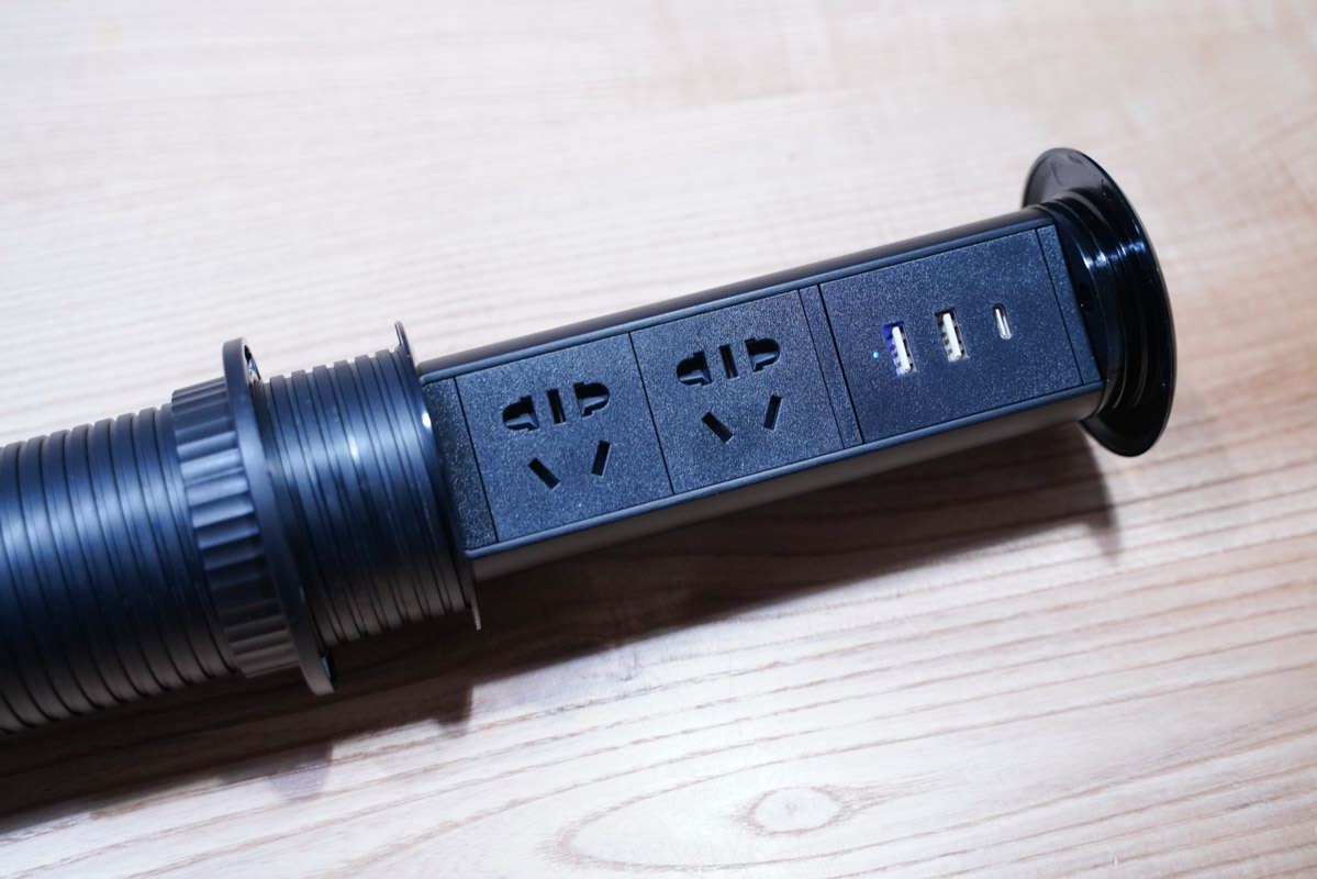 因为墙壁插座位置较远取电不方便,很多用户会在桌面上放一个插线板在上面取电,充电器、线缆、插头一大堆显的比较杂乱。近日,著名插座品牌良工利用常见的桌面穿线孔位置,开发出了圆柱形的电动升降插座,使用时触摸升降开关即可升起插座,不用的时候插座下降隐藏,还用户一个简洁干净的桌面。