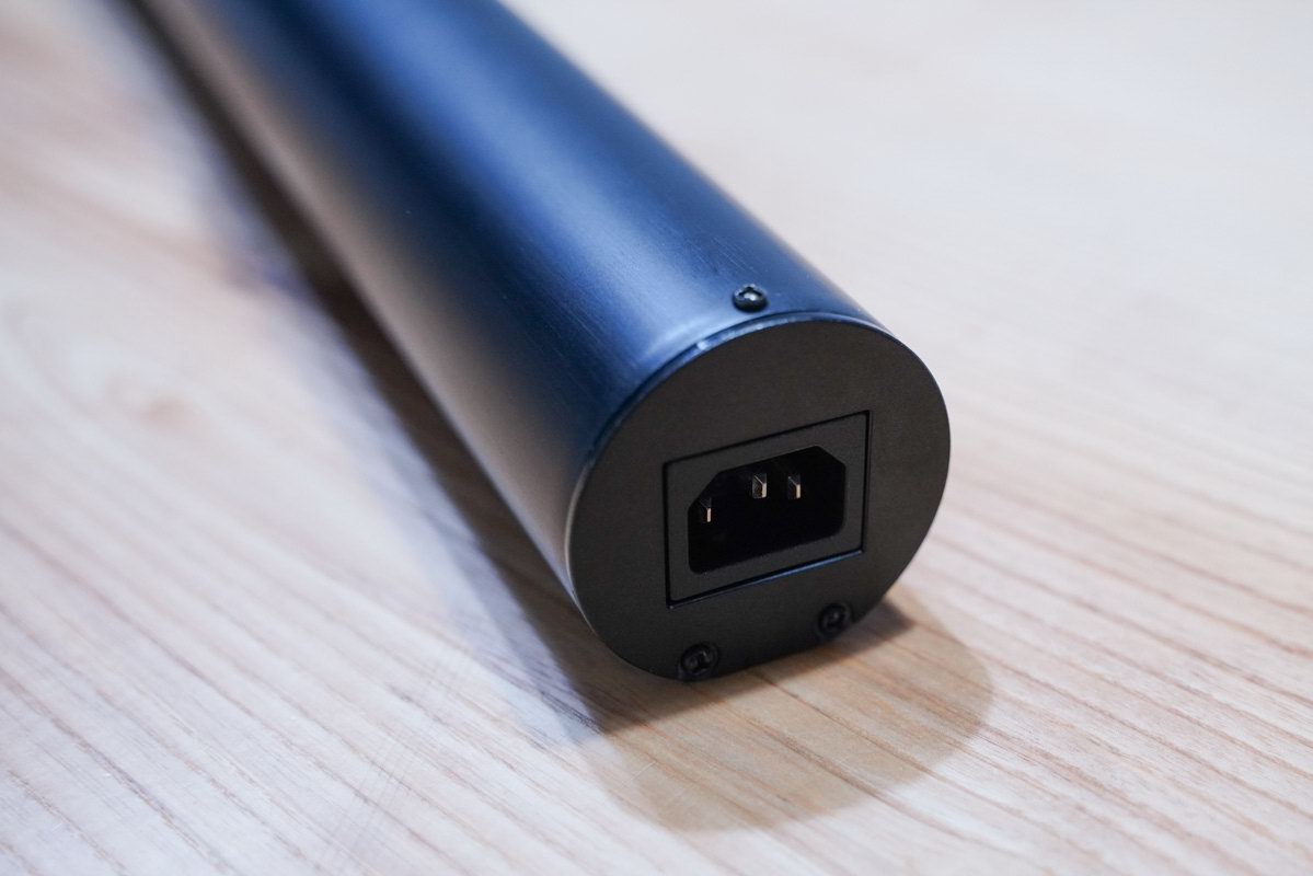 供电接口处于圆柱体底部,是最常见的品字形三脚母座,与电脑ATX电源、电饭锅等设备上很常见到这种插孔,配送的线缆为常见的品字线。底部出线也方便线缆的整理,不会干扰用户腿部位置。