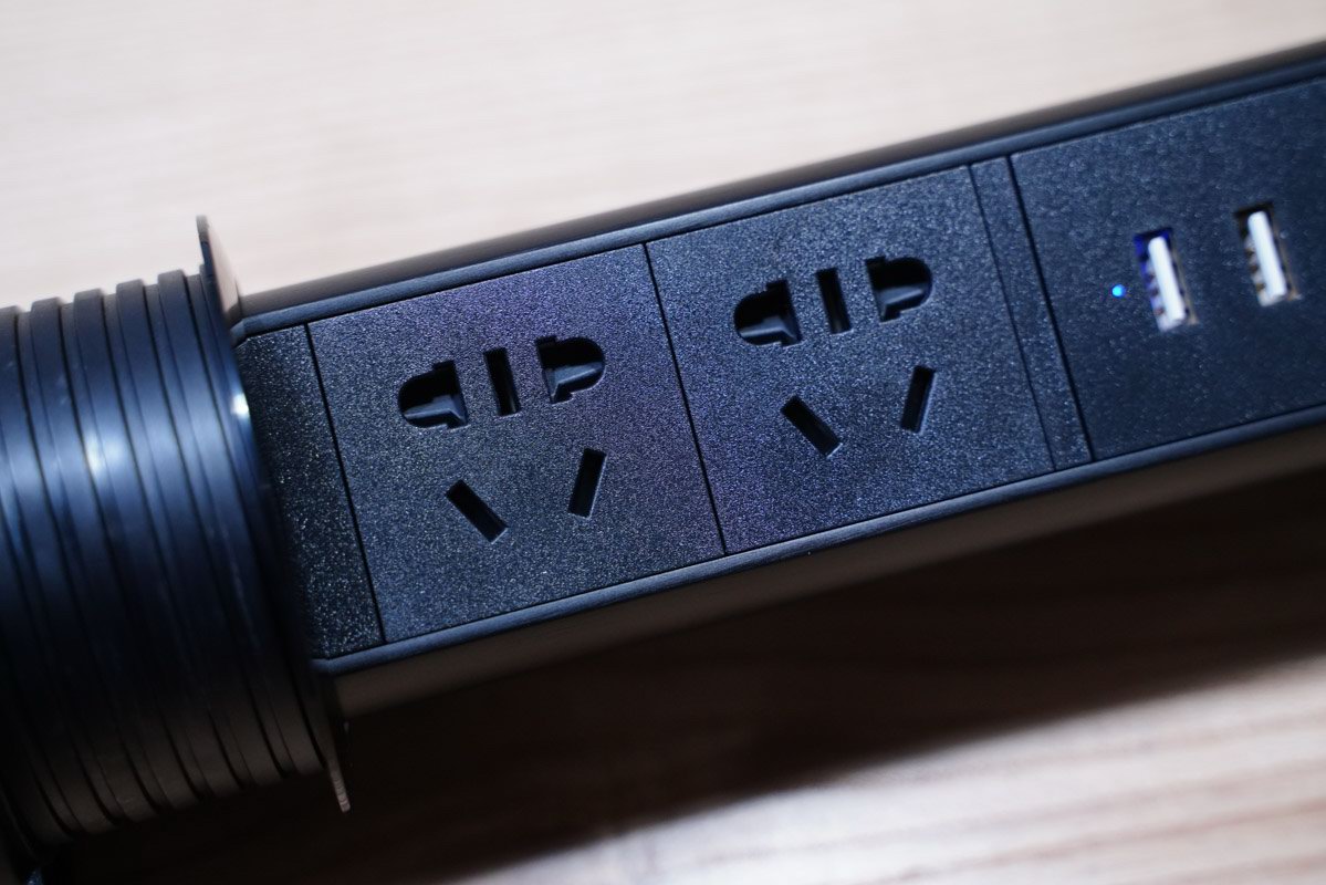 升起的插座模块可以看到带有交流插孔与USB模块,交流部分带有两个2+3国标插孔,内部带有安全门设计,避免异物单边插入造成触电危险。