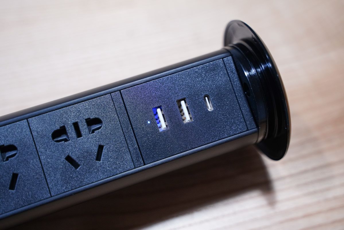 良工桌面电动升降插座充分利用了办公桌穿线孔的位置,通过电机控制插座与USB模块升起/降下,大幅度精简用户桌面。两个2+3国标交流插孔全部带有安全门设计,USB模块为常见的2A1C万金油配置,支持20W PD快充输出与多协议快充,满足iPhone 12的快充需求。