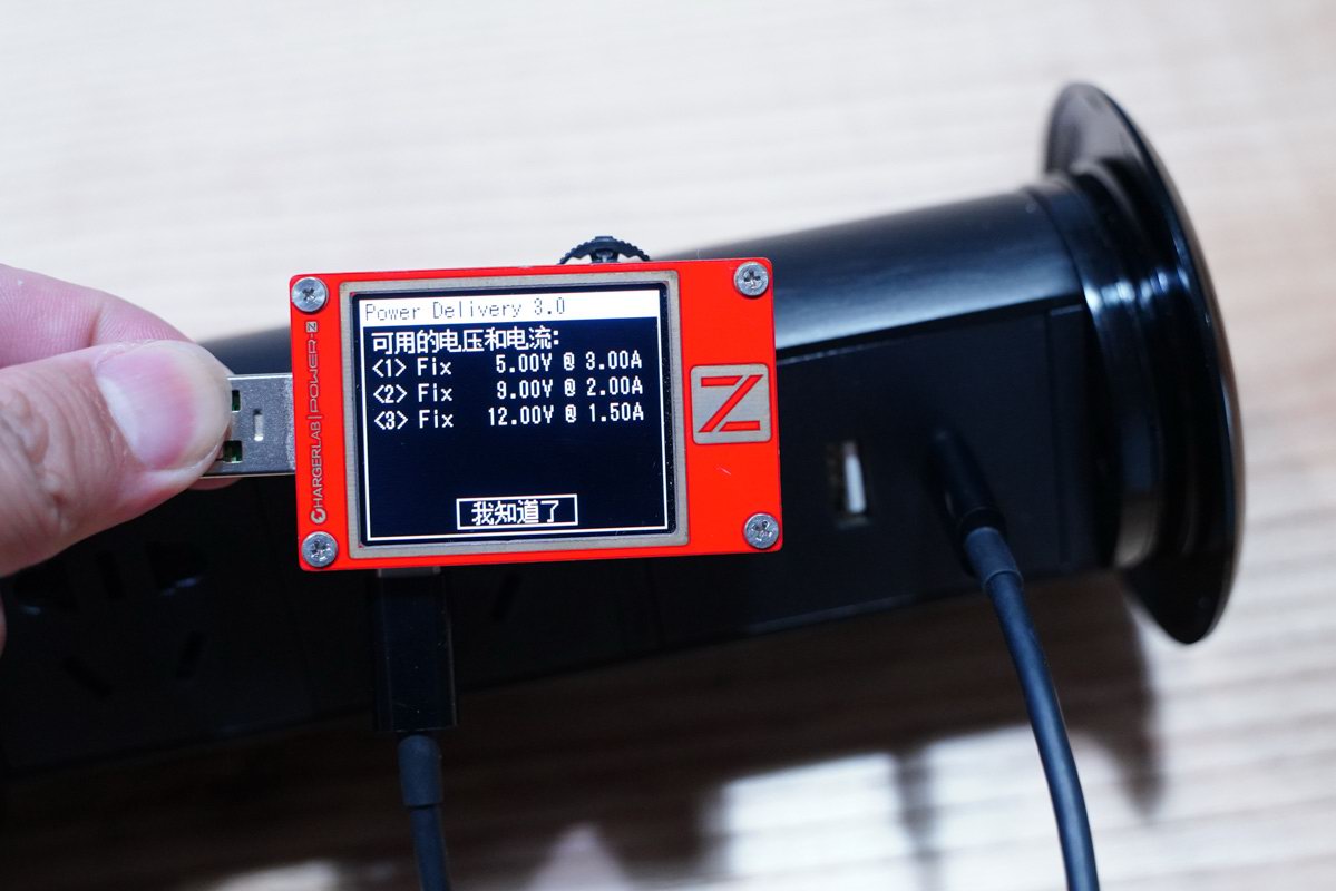 使用POWER-Z KT002 USB测试仪读取PDO报文,良工电动升降插座USB-C接口基于PD3.0标准开发,支持5V3A / 9V2.22A / 12V1.66A,最大输出功率20W,可满足iPhone 12快充的性能需求,半小时充入50%电量。