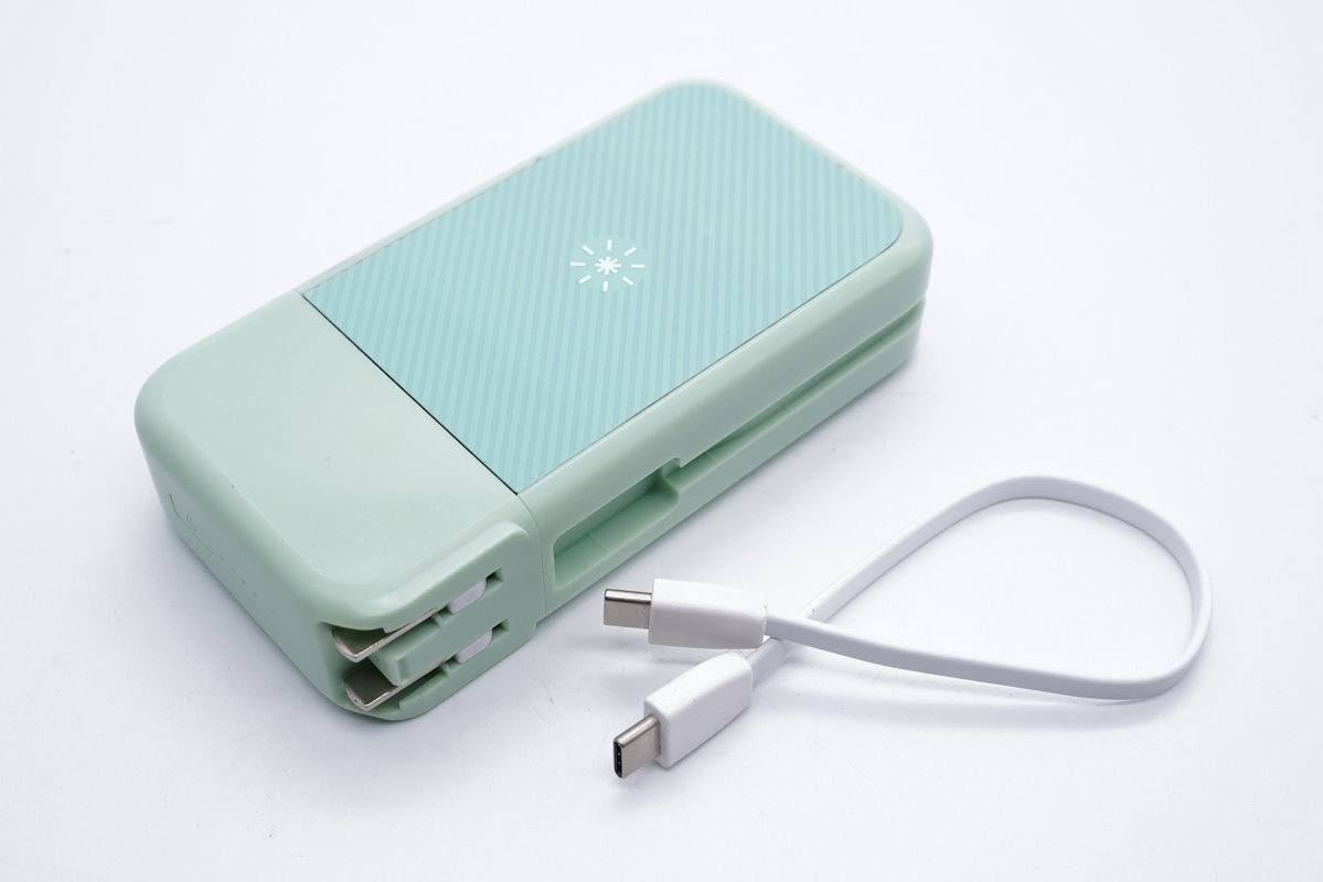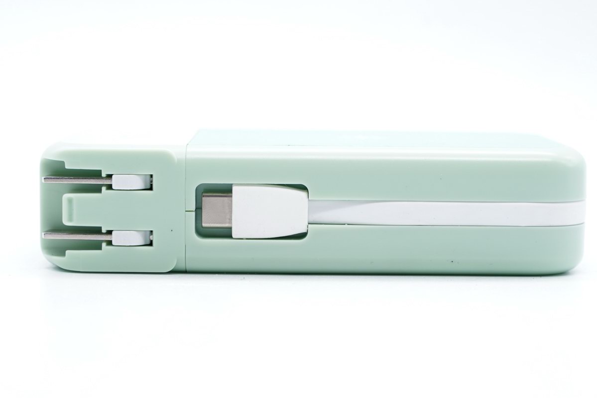 另一个角落可以看到可折叠插脚,这是德立华磁吸四合一充电宝的另一种功能,拉出插脚插入插座后,德立华磁吸四合一充电宝摇身一变成为充电器模式,通过内置的电源适配器对自身锂电池充电,也可以通过USB输出口对其他数码设备充电。插脚可以替换成不同地区的旅行插脚使用,支持100-240V 50/60Hz全球电网输入。