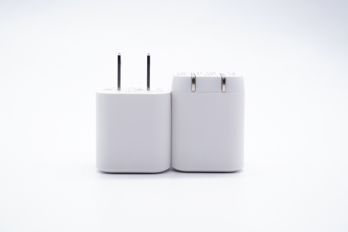 古石30W氮化镓充电器整体呈现白色的外观,单USB-C输出接口,带有固定插脚和可折叠插脚两个版本,固定插脚的体积更小一些。