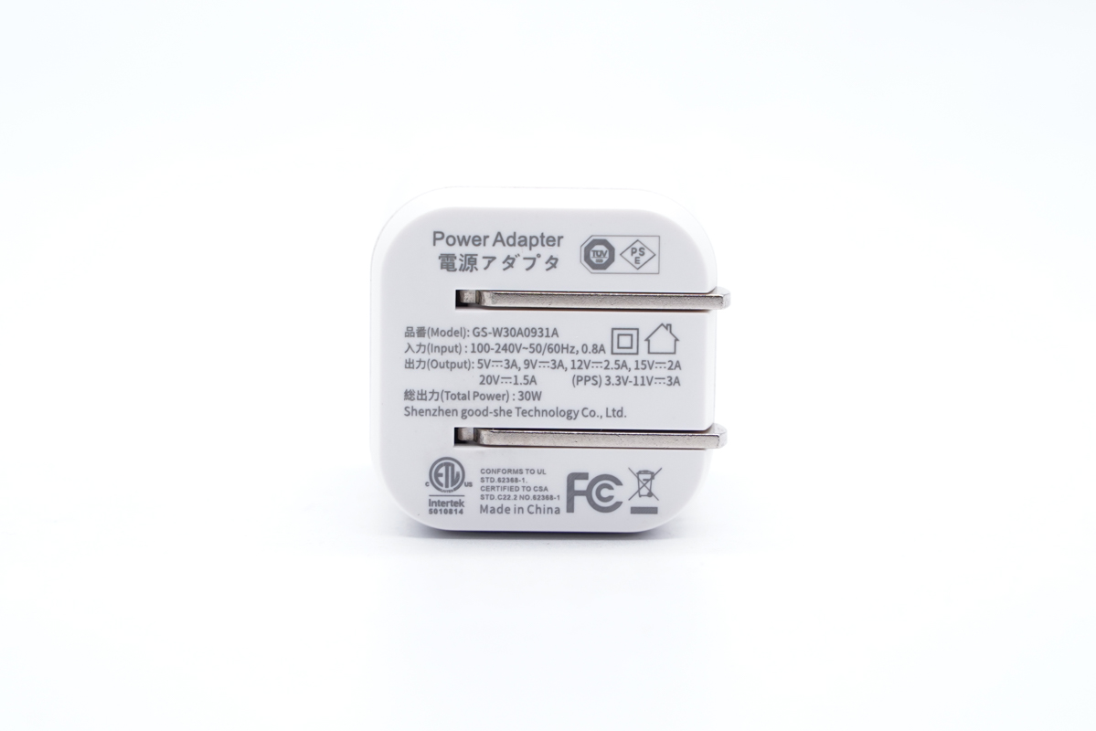 充电器的型号为GS-W30A0931A,支持100-240V 50/60Hz 0.8A的宽电压输入,支持5V3A、9V3A、12V2.5A、15V2A、20V1.5A五个固定电压档位输出,支持3.3-11V 3A一组PPS档位输出,输出功率为30W。