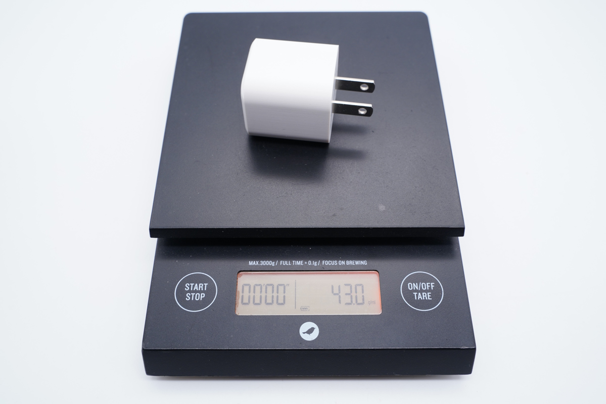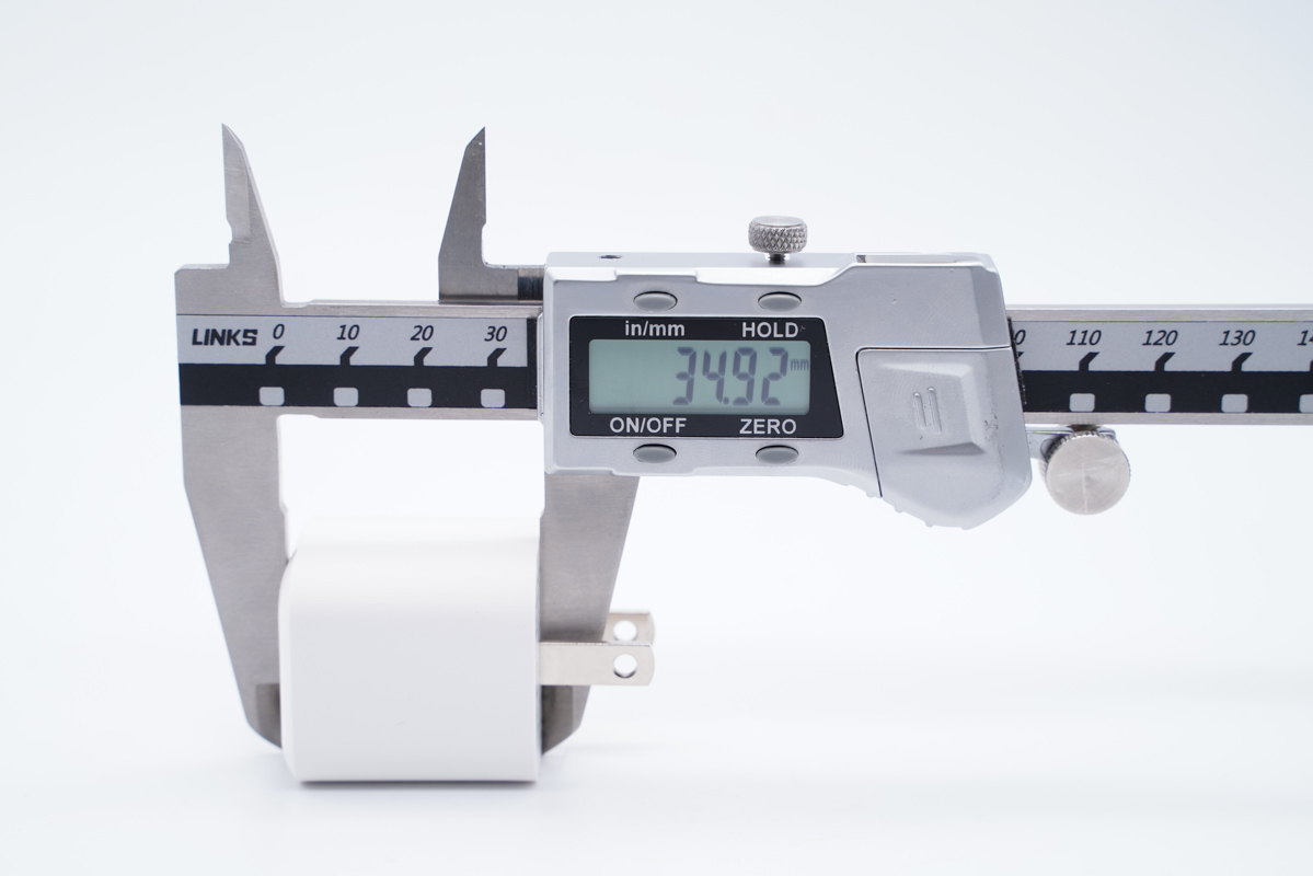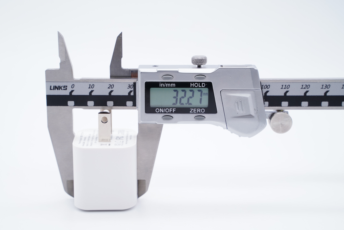 由此可以得出充电器的三围参数为32.28x32.27x34.92mm,充电器的体积约为36.37cm³,以最高输出30W计算,功率密度约为0.82W/cm³。