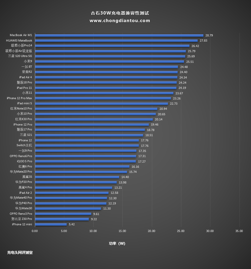 柱状图这里,整体的走向较为平缓,MacBook Air M1的功率最高,达到了28.79W,已经达到了充电器的最大输出功率。