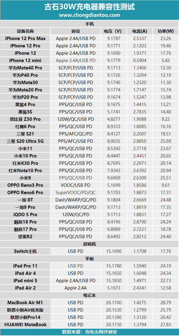 测试数据汇总,充电器支持5-20V的全电压档位,可以为笔记本和iPad提供高压快充,为手机提供大功率充电,整体表现不错。