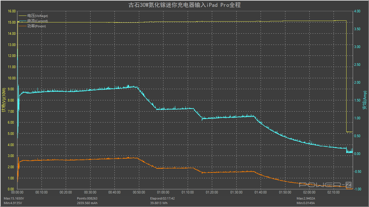 使用充电器为iPad Pro 2018 11寸充电,约22分钟前功率处于26W左右,随后功率和电流开始呈阶梯式的下降状态,全程耗时约2小时15分,最高功率为15V 1.93A 29.05W。