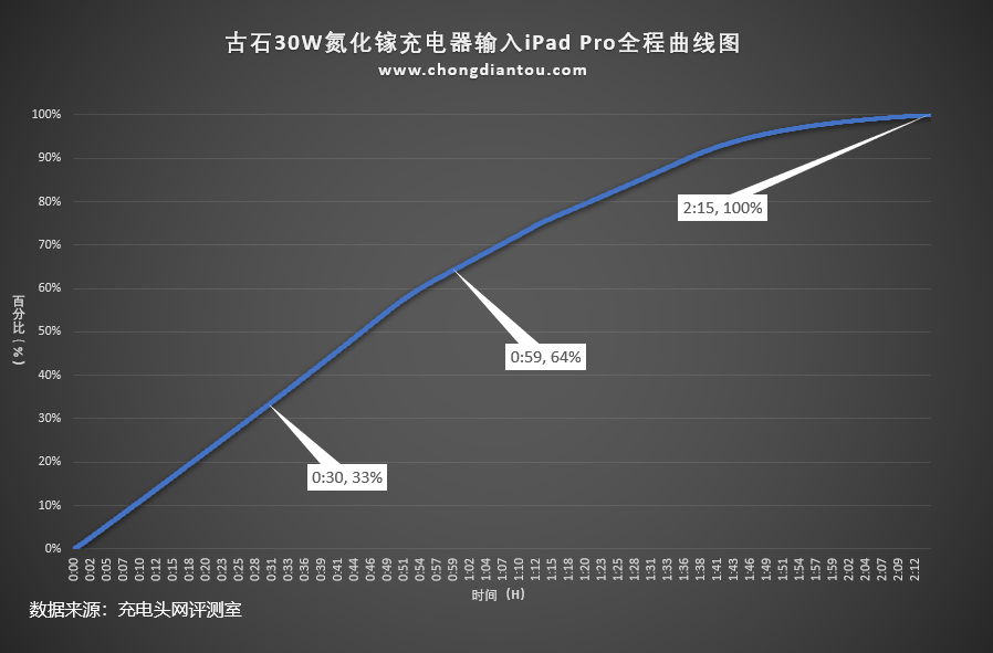 因为充电器支持30W的输出功率,已经可以为iPad提供快充服务了。所以此次加入了为iPad Pro充电全程的测试数据,下面是实测结果。