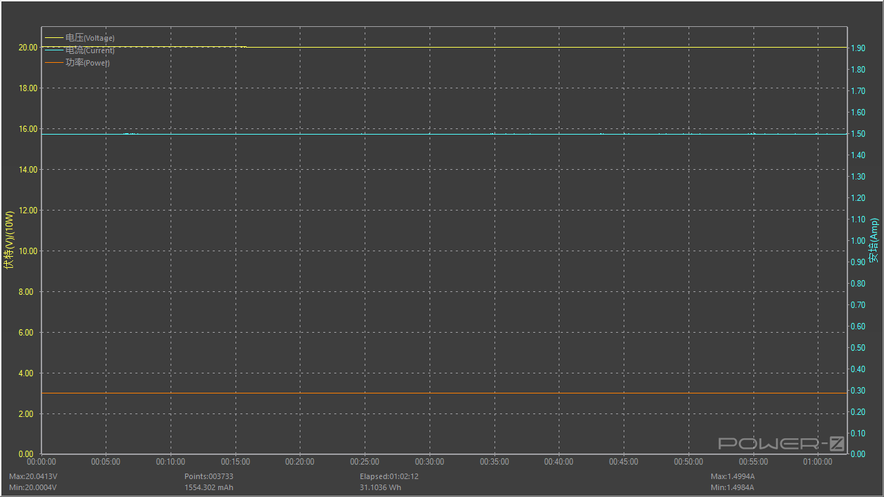 按照额定功率20V 1.5A 30W满载对充电器进行稳定性测试,测试时间为一小时,测试过程中电压值呈水平直线,无明显波动情况,长时间满载比较稳定。