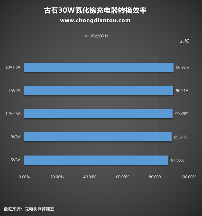 110V 60Hz下,充电器的转换效率从87.95%到90.97%不等。