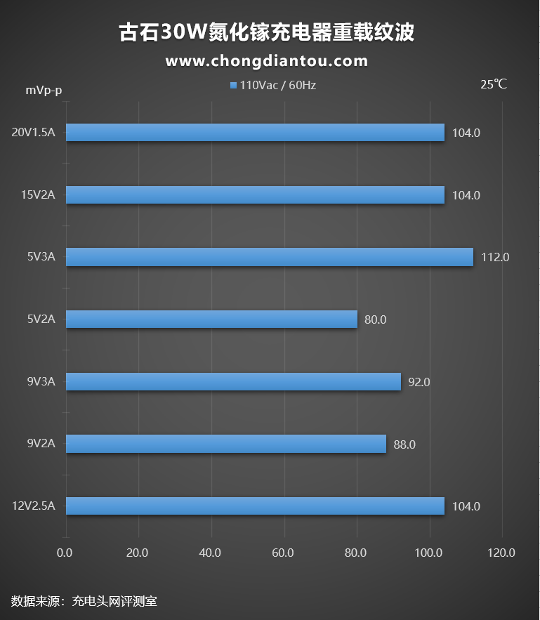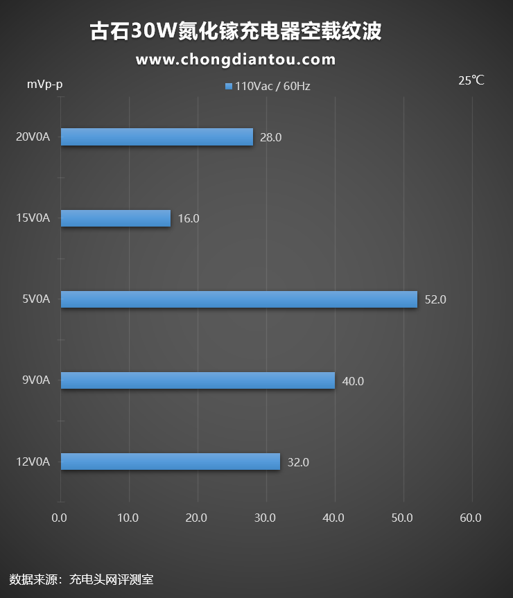 国家标准中充电器纹波要求是不高于200mVp-p,古石30W氮化镓充电器在110V 60Hz、220V 50Hz输入电压下,所有输出功率纹波峰峰值均低于200mVp-p这个标准,表现不错。